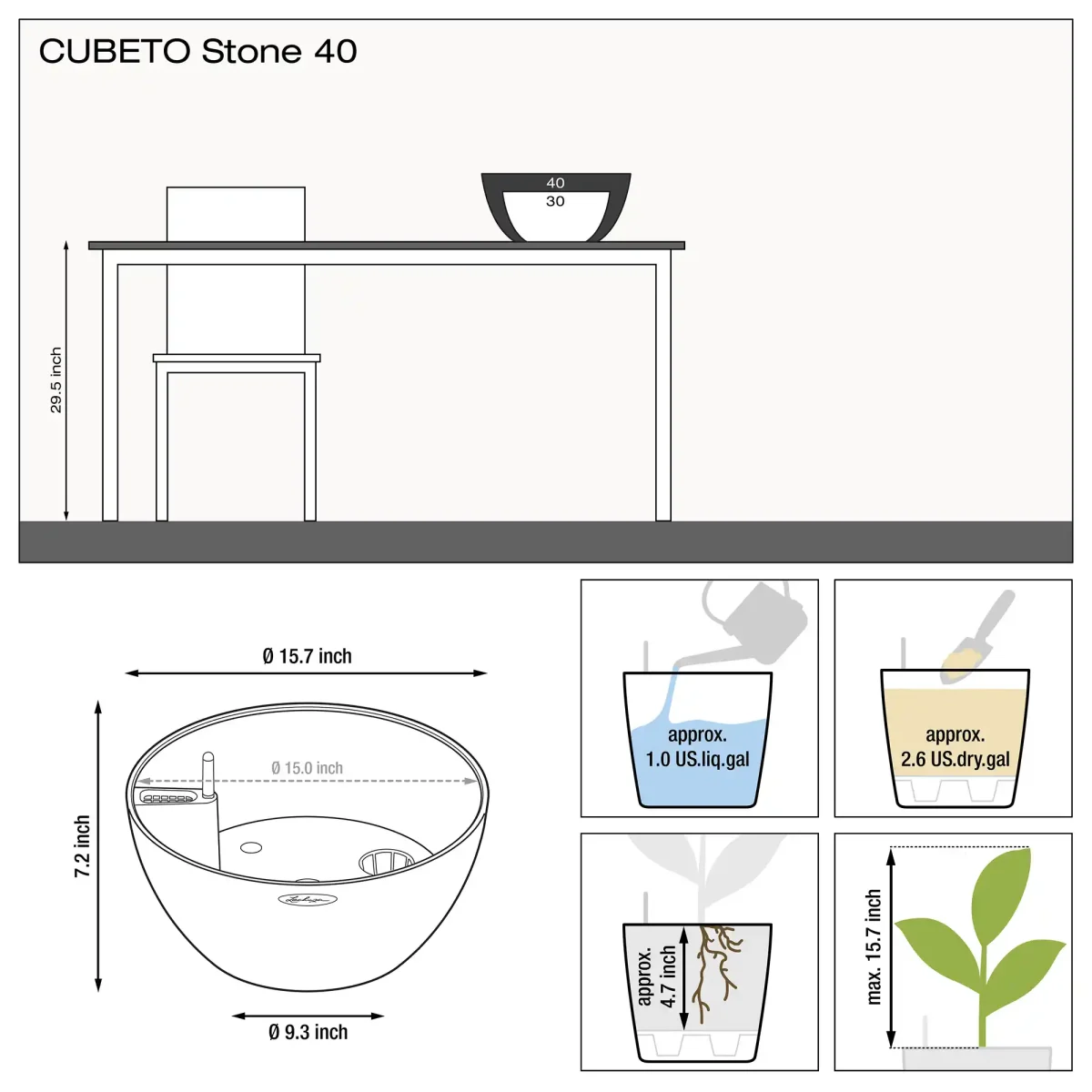 CUBETO Stone 40 Stone Grey, Self-Watering Bowl Planter, D15.7 H7.1 in