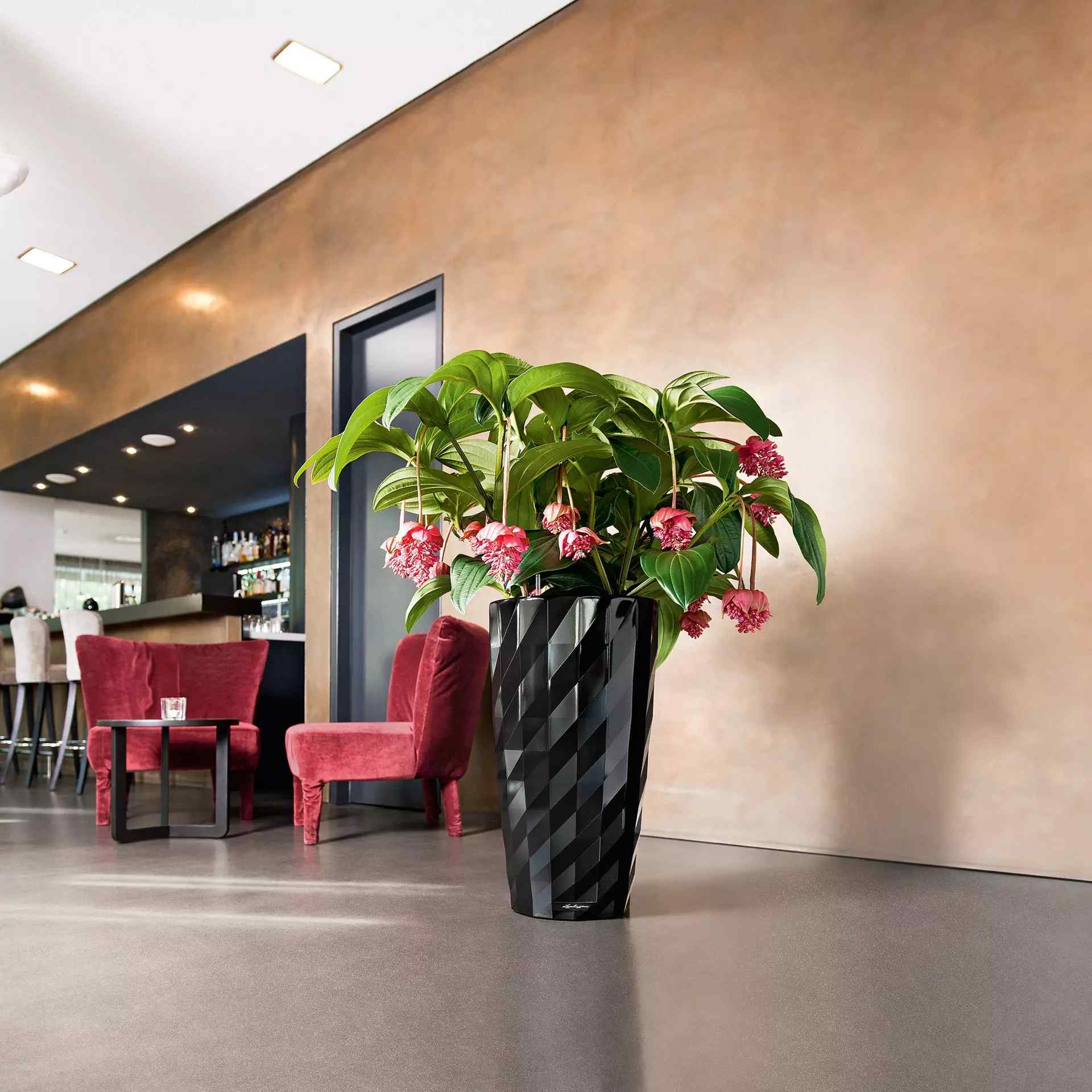 The exchangeable planter liner with retractable handle frame and overflow function as well as the proven LECHUZA irrigation system make the DIAMANTE a unique and versatile planter. The DIAMANTE is a design statement, with its brilliantly polished surface and vivid reflections.