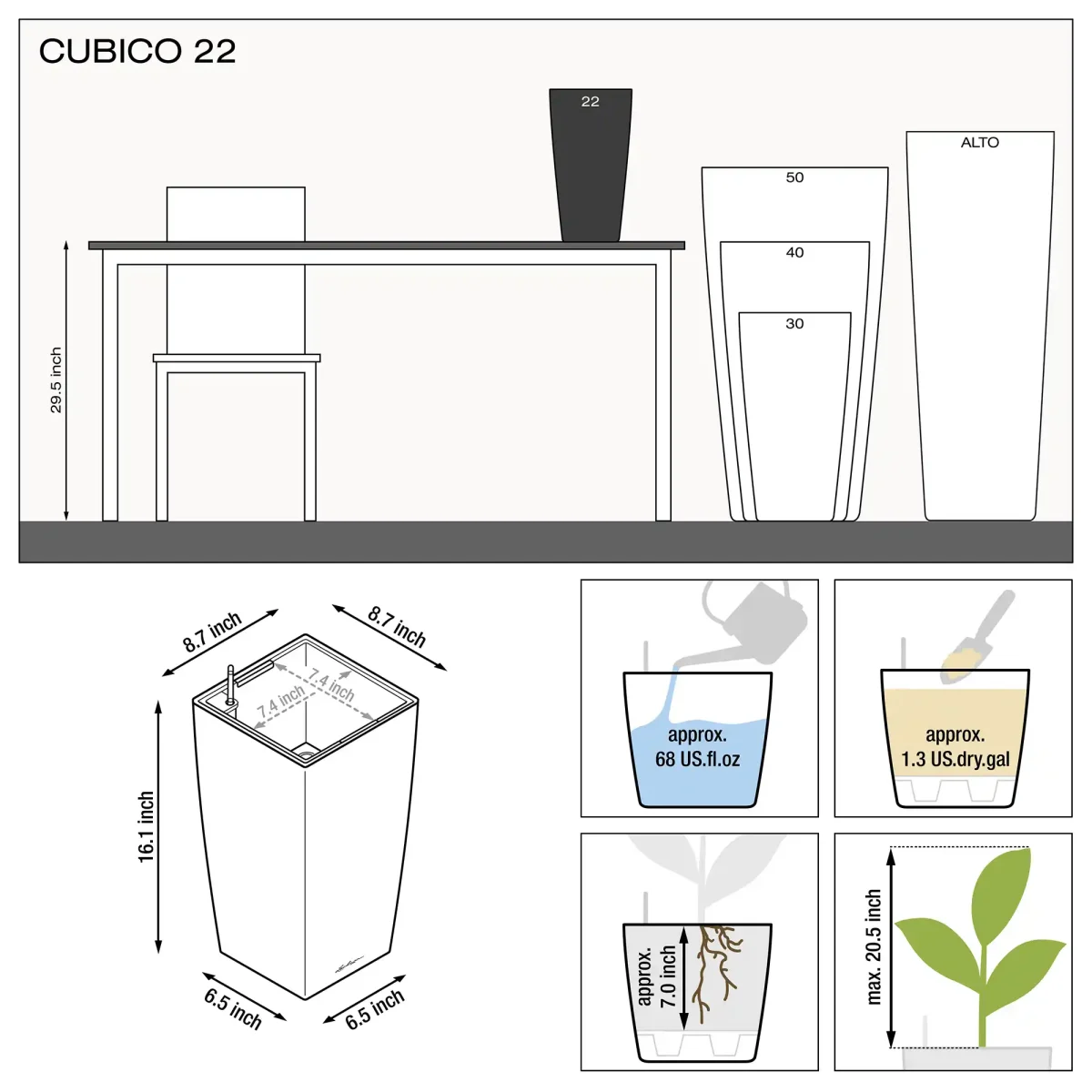 | Plant volume | 1.3 dry gal | 3.2 dry gal | 7 dry gal | 13.8 dry gal |